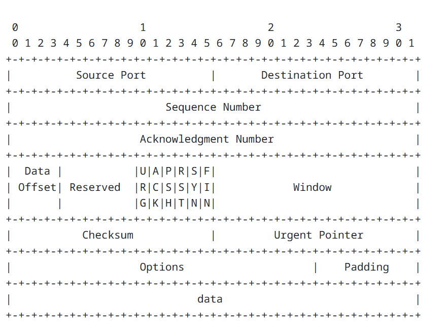 Cette image d’en-tête est la même que celle du dessus sauf qu’elle présente les différents flags ou bits de contrôle ou de signalisation : URG, ACK, PSH, RST, SYN, FIN.